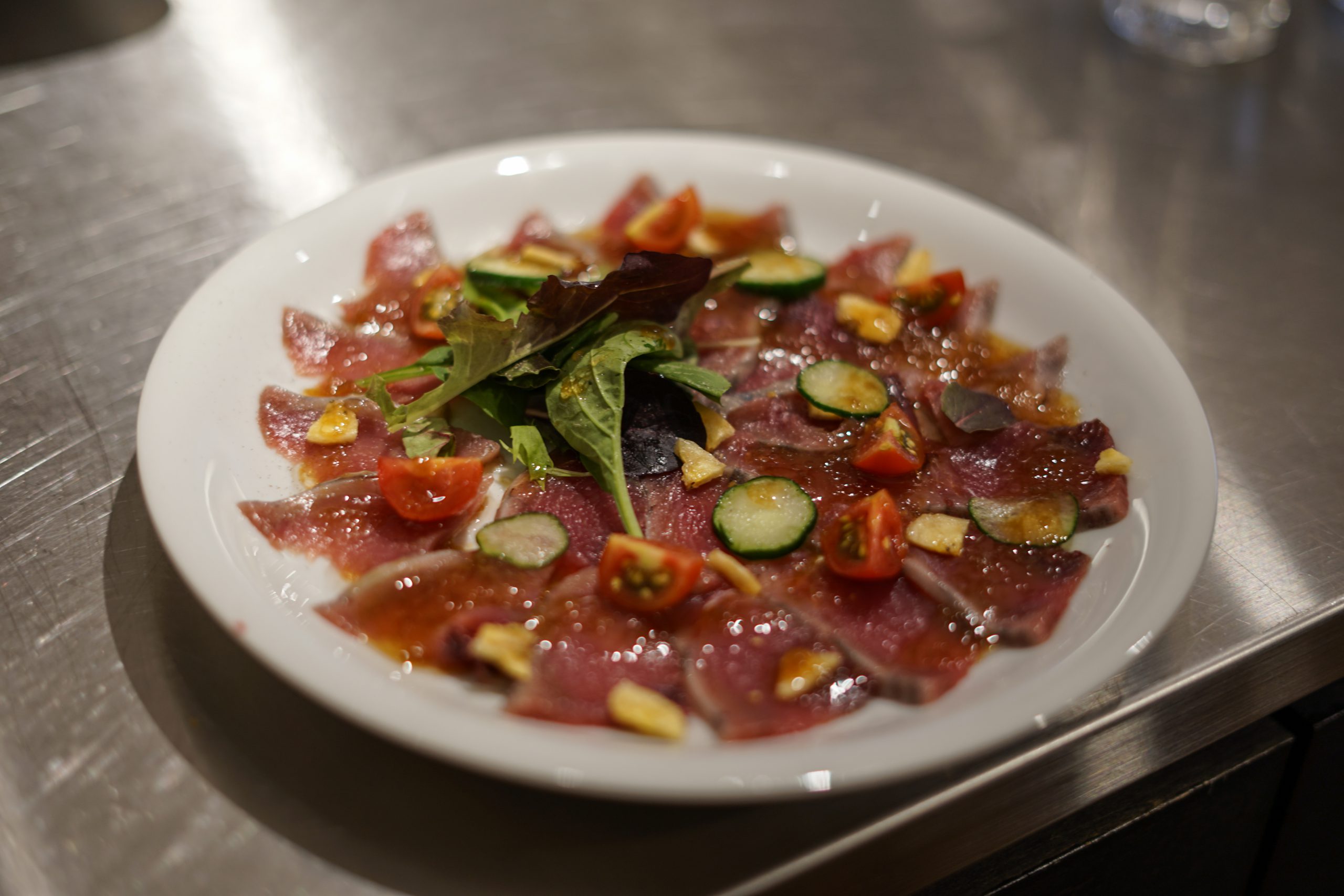 鯛の淡白な味わいにトマト、玉ねぎ、きゅうり、ケッパー、白ワインビネガーで作る爽やかな野菜のドレッシングをかけていただくカルパッチョです。
