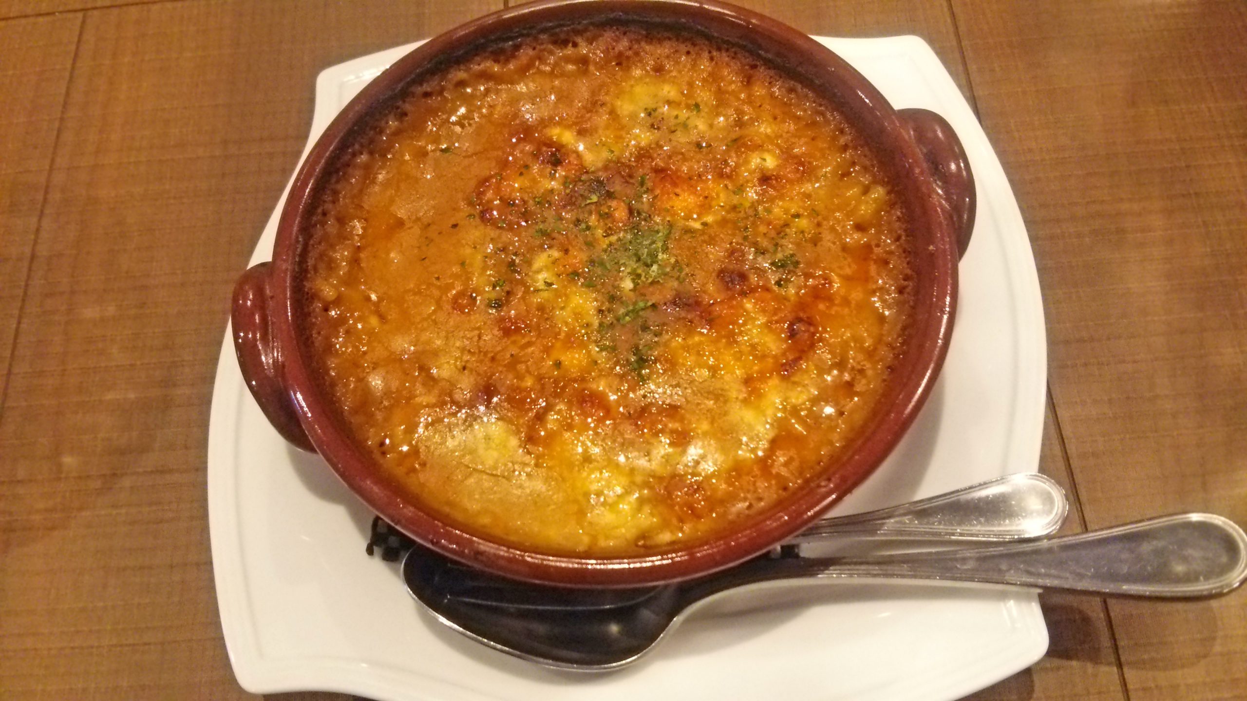 ソースはベシャメルソースに海の幸を合わせたバランスの良いもので、パルメザンチーズをふりかけてオーブンで焼き上げました。