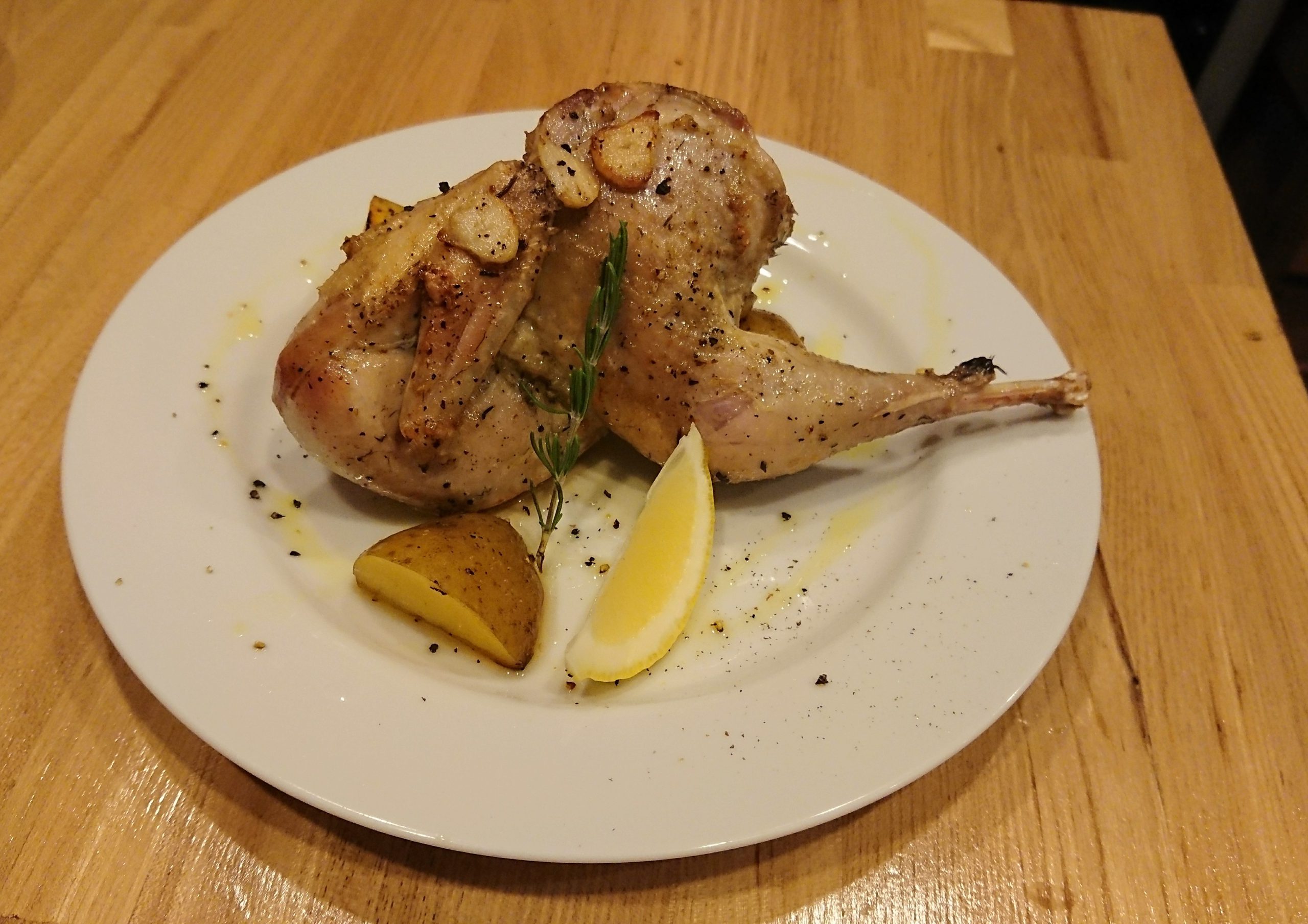 素材を活かすため味付けは塩コショウのみ。1時間かけてじっくり焼き上げられた若鶏は身がパンパンにふくれ、皮はパリパリ、中はジューシー。