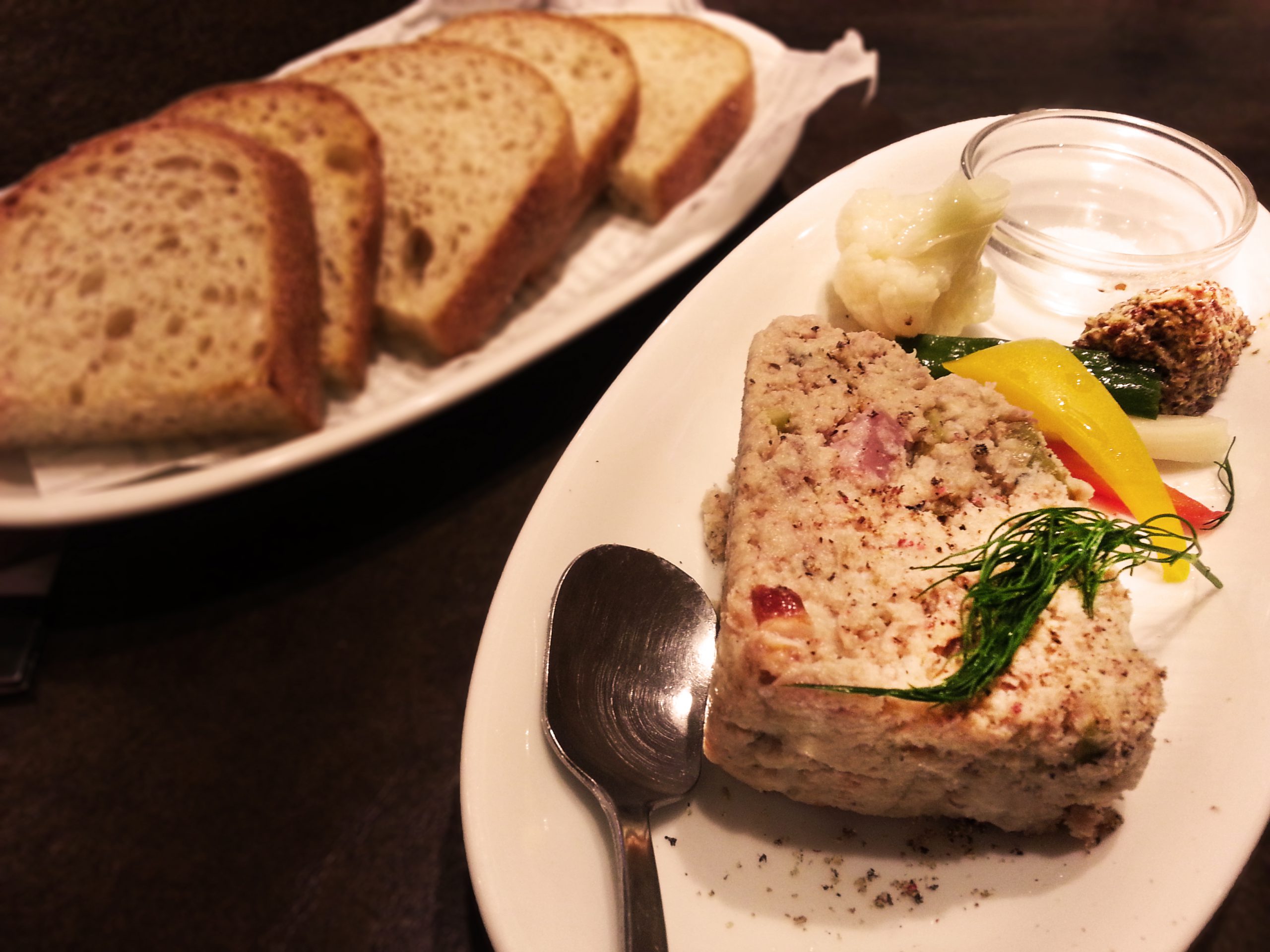 3種チーズと燻製豚肉のコクが溶け合う個性派パテと、豚レバーに香辛料を利かせてなめらかな食感に仕上げたアルザス風パテ。